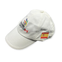 White cotton cap featuring embroidered WorldSkills branding, including the text “WorldSkills Calgary 2009 logo” on the front and “WorldSkills International” on the side. It also includes embroidered national flag of Spain,. Produced as official apparel for the 40th WorldSkills Competition, Calgary 2009.