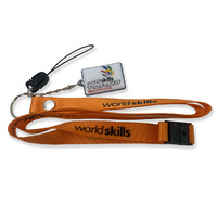 Lanyard with keychain, WorldSkills Shizuoka 2007 Orange lanyard with the WorldSkills logo printed in black, accompanied by a rectangular keychain tag featuring the WorldSkills Shizuoka 2007 logo and date. Produced as official event merchandise. -