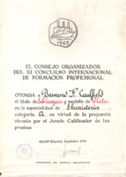 Silver medal certificate to Desmond F. Caulfield 11th International Vocational Training Competition, Gijón 1962 Silver medal certificate to Desmond F. Caulfield in Cabinetmaking, 11th International Vocational Training Competition, Gijón 1962 -