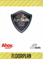 EuroSkills Rotterdam 2008 floorplan Fold-out floorplan of the EuroSkills Rotterdam 2008 competition held at Ahoy Rotterdam, showing the layout of the competition halls, skill competition areas, demonstrations, entrances, and visitor facilities. The plan identifies the different skill competition zones grouped by sector, with numbered areas corresponding to individual skill competitions. The reverse side includes logos of event partners and sponsors. -