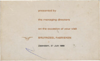 Folder from Bruynzeel Fabrieken, Zaandam 1966 Folded souvenir folder presented by Bruynzeel Fabrieken on the occasion of a visit to the company in Zaandam, dated 27 June 1966, held in connection with the 15th International Vocational Training Competition in Utrecht. It includes a printed card with the company logo, a black-and-white aerial photograph of the factory, a group photograph of the visitors in front of the Bruynzeel building, and a back page with multiple handwritten signatures. -
