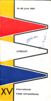 15th International Vocational Training Competition, Utrecht 1966. Handbook Handbook providing the official programme and general information for the 15th International Vocational Training Competition held in Utrecht, Netherlands, from 14 to 29 June 1966. It includes messages from Eugenio Lopez, President of the International Committee, details about trades (30 skills), participating countries, accommodation, organizational committees, and a day-by-day schedule of events, excursions, and ceremonies. The document also lists supporting institutions and companies that contributed to the event. -