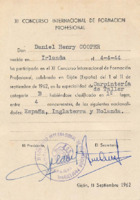 Third place certificate to Daniel Henry Cooper, 11th International Vocational Training Competition, Gijón 1962 Third place certificate to Daniel Henry Cooper in Joinery, 11th International Vocational Training Competition, Gijón 1962 -