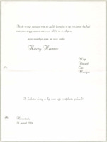 Death notice for Harry Hamer, 24/03/1984 (NL) Announcement of his passing at the age of 58, signed by his wife Miep and children Vincent, Eric, and Monique, noting that he was laid to rest in a private family ceremony in Heemstede, the Netherlands. -