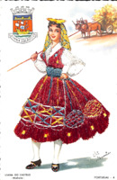 Series of embroidered postcards, Portugal, 1960s Set of embroidered postcards depicting women in traditional regional costumes from Portugal, including Viana do Castelo (Minhota), Faro (Camponesa), Aveiro (Moliceira), and Nazaré. Each postcard features the respective city crest and embroidered details highlighting the costumes. -