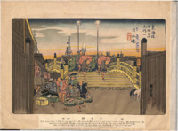 Hiroshige’s “Fifty-three stages of Tōkaidō” Reproduction of Hiroshige’s 1831 print depicting the environs of Nihonbashi (Bridge of Japan) in Edo, accompanied by explanatory text highlighting its historical and cultural significance. -