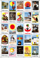 Sheet of tourism stickers, Portugal, 1960s Sheet of 25 stickers promoting Portuguese regions, cities, and cultural themes. Designs combine photographic and graphic art styles with multilingual slogans. -