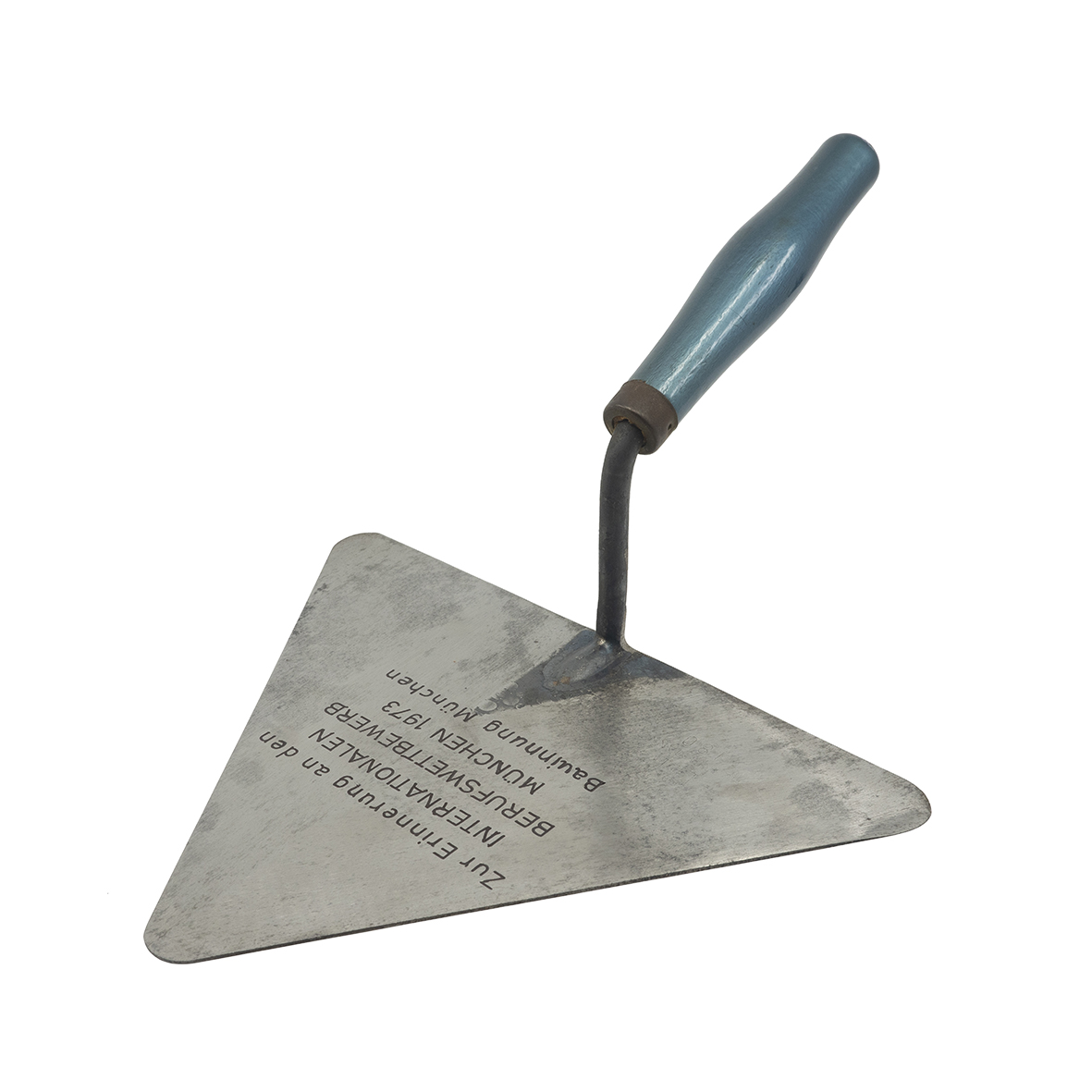 An engraved trowel with a blue handle from the 1973 International COmpaetition held in Germany. An inscription on the flat, pointed blade shows that the event was held in Munich in 1973.