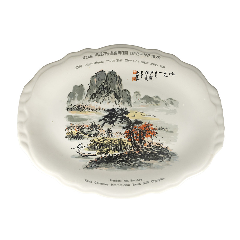 - Commemorative plate, 24th Youth Skill Olympics, Busan 1978. A bucolic scene of a natural landscape with a small figure on the bottom left is depicted in shades of black and grey. The date, location and words ‘President Nak Sun Lee Korea Committee International Youth Skill Olympics’ – as the competition was called in those days – is written on the edges.