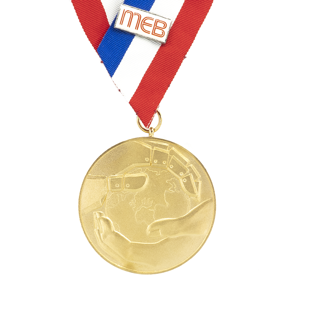 - A blank medal made for the 1989 competition. This is likely a sample of one Gold medal awarded to a winner. Attached to the ribbon is a lapel pin, with the initials MEB, the logo of the Midlands Electricity, an event sponsor and likely a souvenir giveaway.