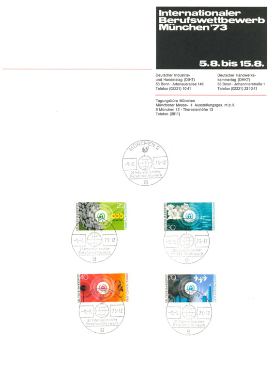 - Three sets of German stamps issued in 1973, the year competition was held in Munich with Circular Date Stamps indicating the city’s name, event, and date. The stamps are fixed to official letterhead. The postal markings also show the IVTO logo. The stamps are based on different themes - birds, environmental protection, and coats of arms - but they are not linked to the contest.