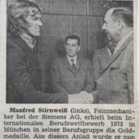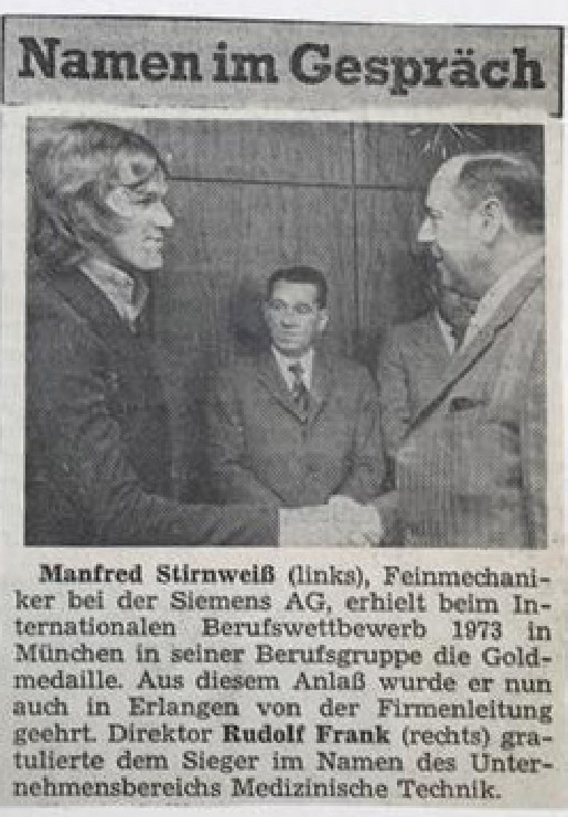 Photo and caption: Manfred Stirnweiss, precision mechanic at Siemens AG, received the Gold medal in his occupational group at the 1973 Munich in his occupational group.