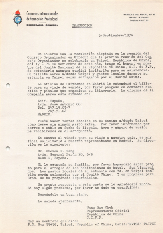 IVTO Organizing Committee meeting in Taipei on 17-24/11/1974. Invitation letter
