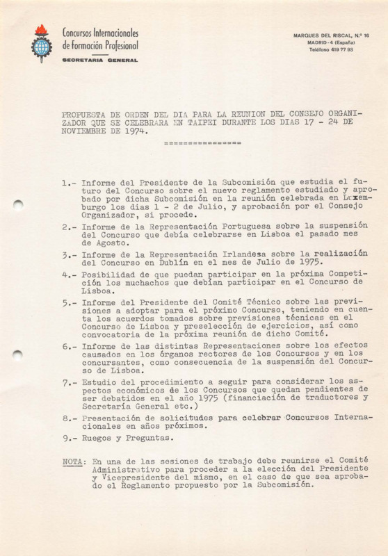 IVTO Organizing Committee meeting in Taipei on 17-24/11/1974. Agenda |