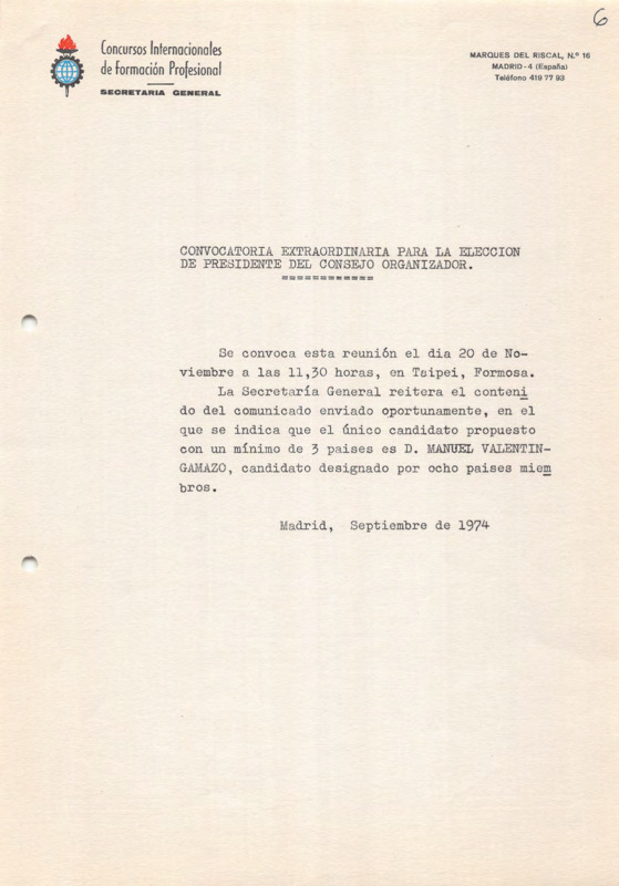- Call for a extraordinary Organizing Committee meeting on 20/11/1974, for the election of IVTO President