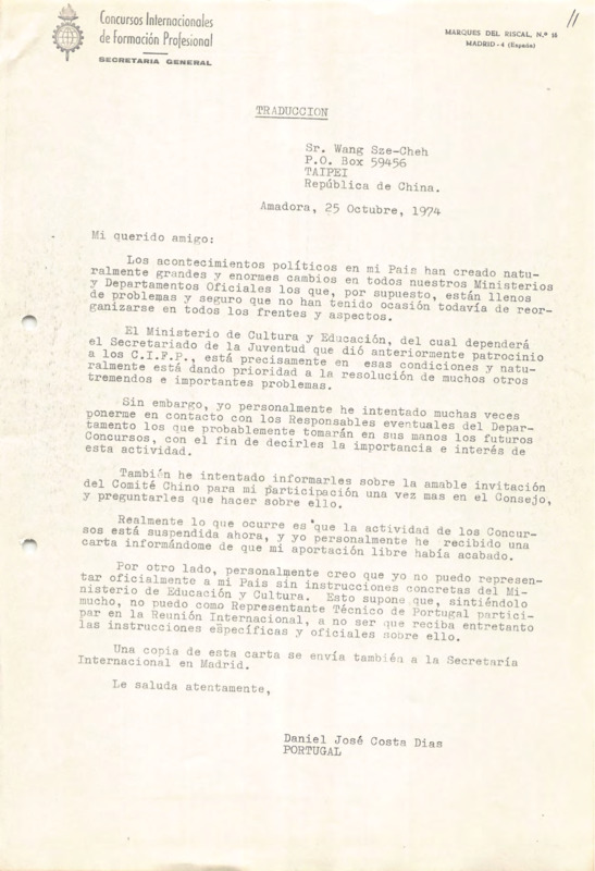 - Letter from Daniel José Costa Dias to Wang Sze Cheh, 25/10/1974