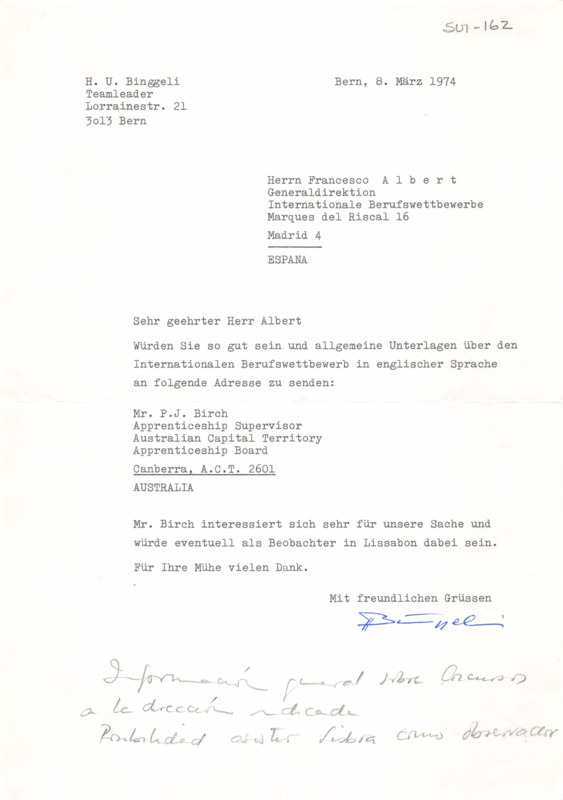 Letter from H.U. Binggeli to Francisco Albert Vidal, 08/03/1974