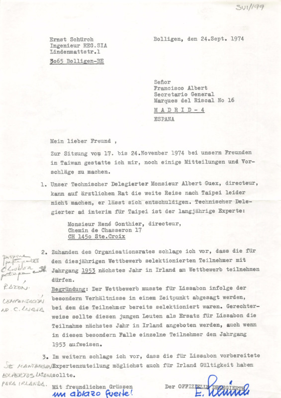 - Suggestion: Experts and Competitors registered for 1974 be allowed to participate in 1975 (apparently in Ireland) due to the cancellation of the Competition in Lisbon 1974, despite age limits.