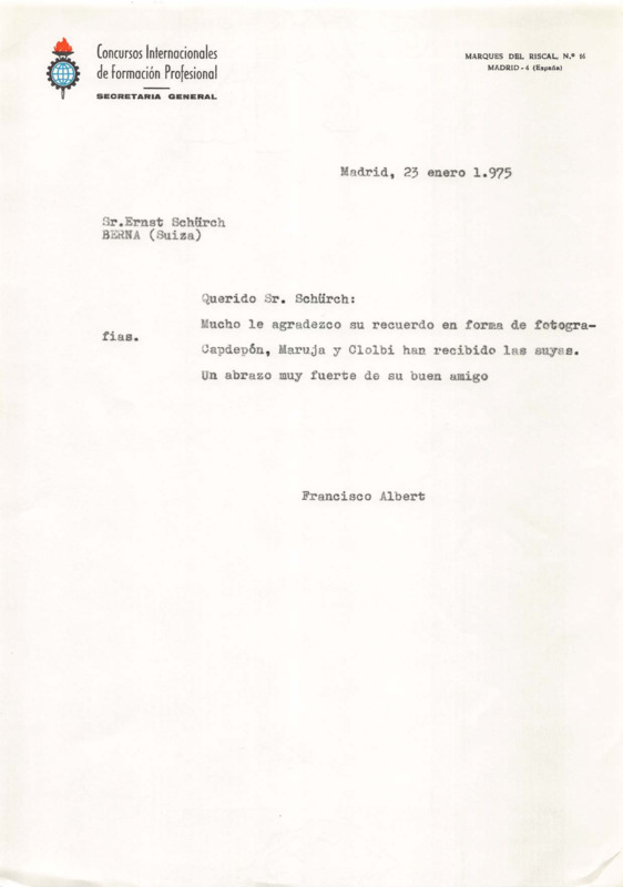 - Letter from Francisco Albert Vidal to Ernst Schürch, 23/01/1975