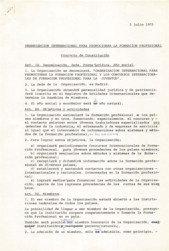 Articles draft for the International Organization for the Promotion of Vocational Training, 03/07/1975