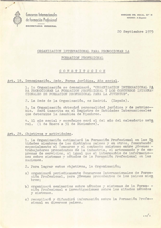 - Articles for the International Organization for the Promotion of Vocational Training, 20/09/1975