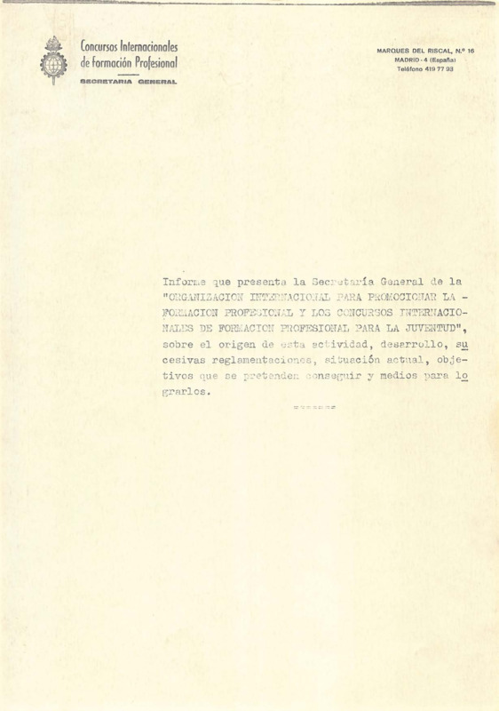 - Origin of the international vocational training competitions, development, successive regulations, current situation, objectives and means to achieve them (Photocopy)