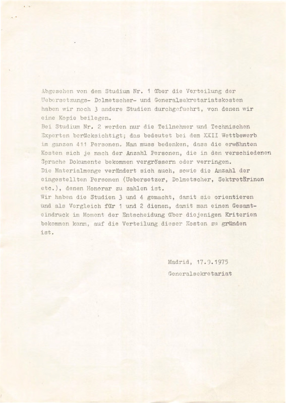 - Report on potential distribution of costs for interpreters and the General Secretariat, by the General Secretariat of the IVTO, 17/09/1975