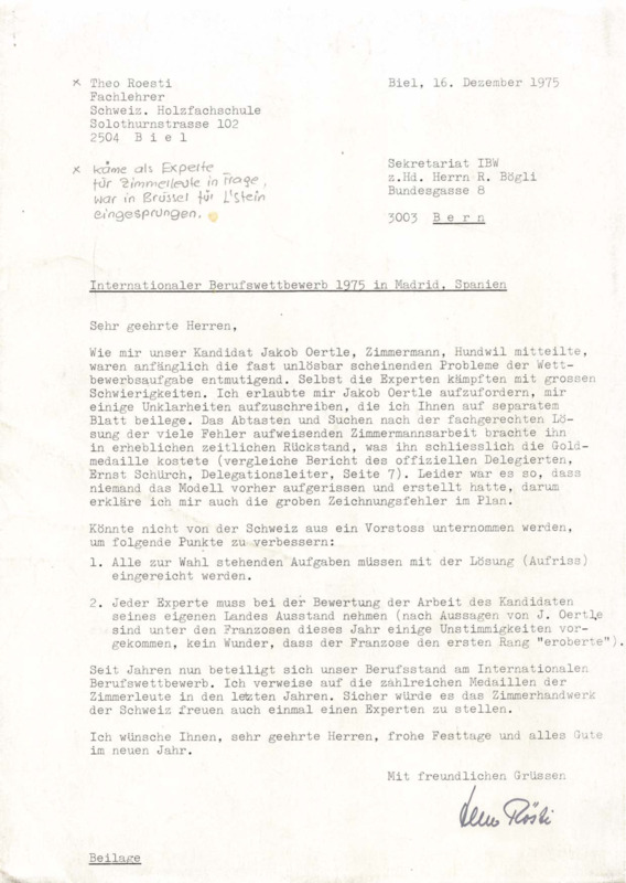 - Letter from Theo Roesti to the Swiss IBW Secretariat, 16/12/1975