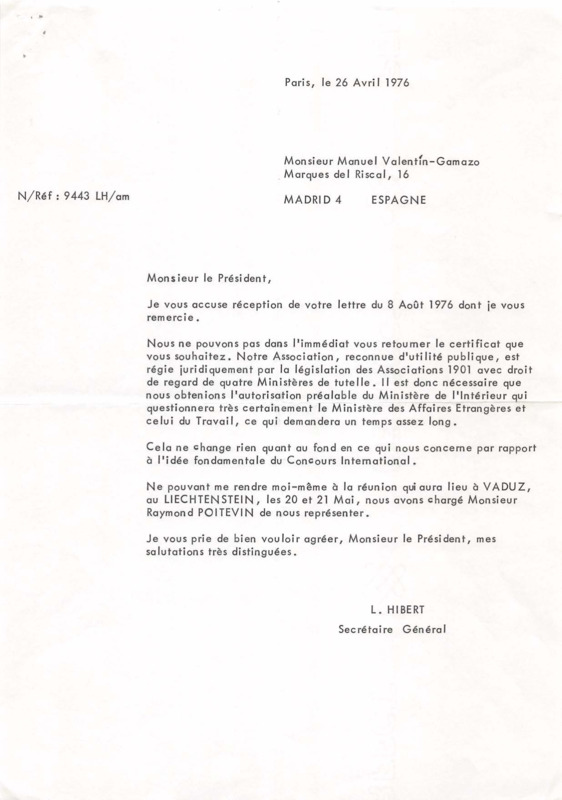 - Letter from L. Hibert to Manuel Vaelntín-Gamazo, 26/04/76