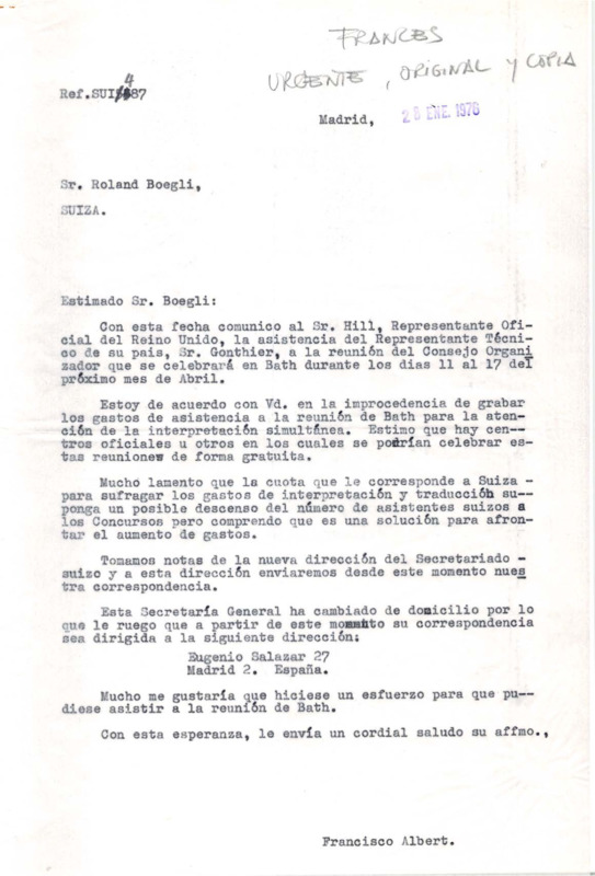 Letter from Mr Albert Vidal to Mr Roland Boegli, 28/01/1976 (original in French and translation into Spanish)