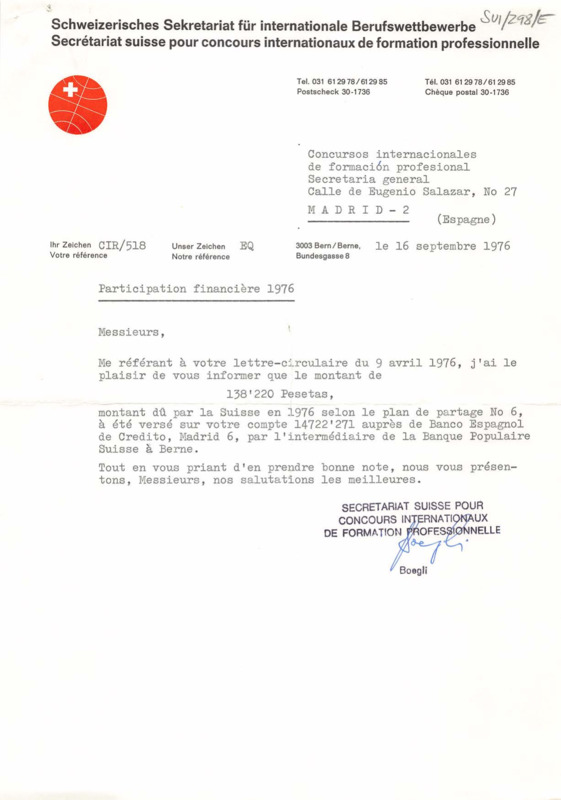 Letter from Roland Boegli to the General Secretariat, 16/09/1976 (original in French and translation into Spanish)
