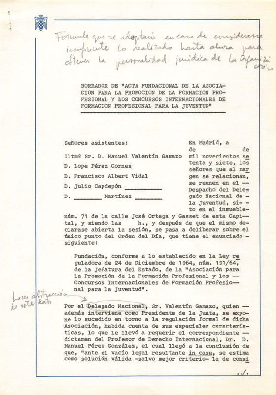 - Draft of the Founding Charter of the Spanish Association for the Development of VET competitions. It is the original typewritten document with some handwriting notes.