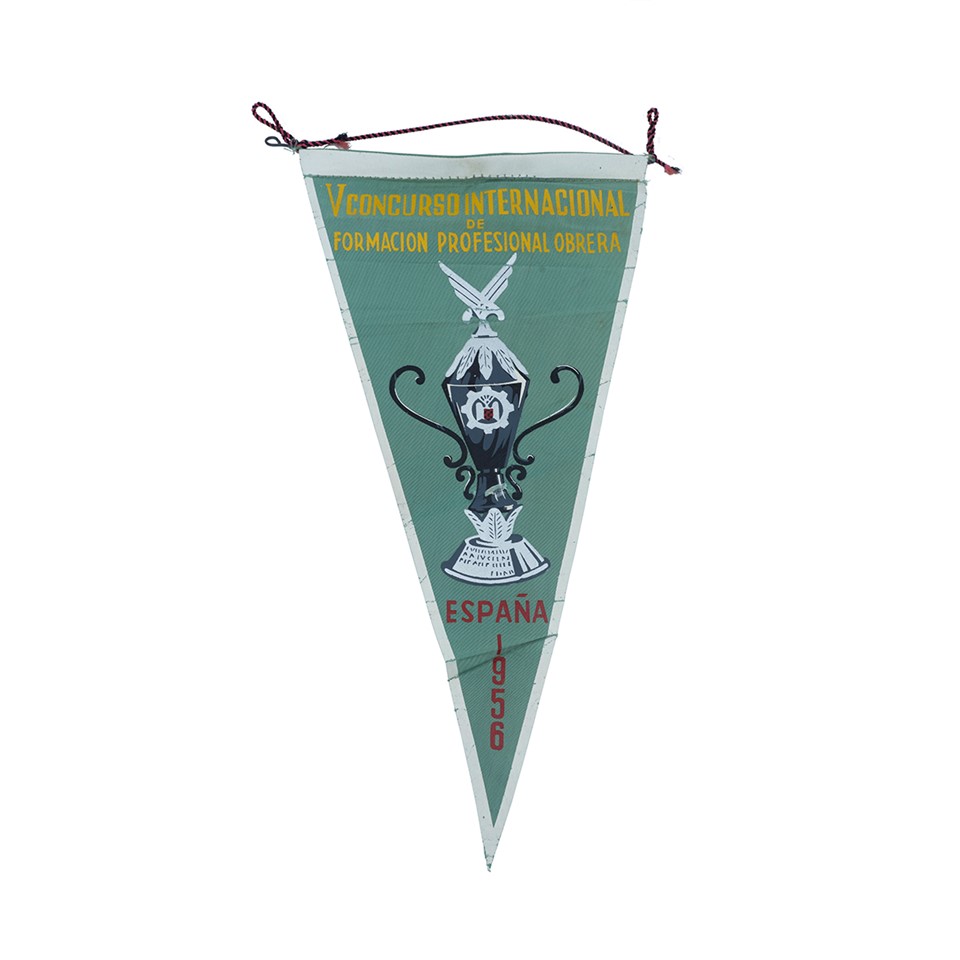- A green and white pennant from the fifth international competition which was held in Madrid 6 – 25 April 1956 at the Virgen de la Paloma Vocational Training Institute. The flag features the trophy awarded to winners