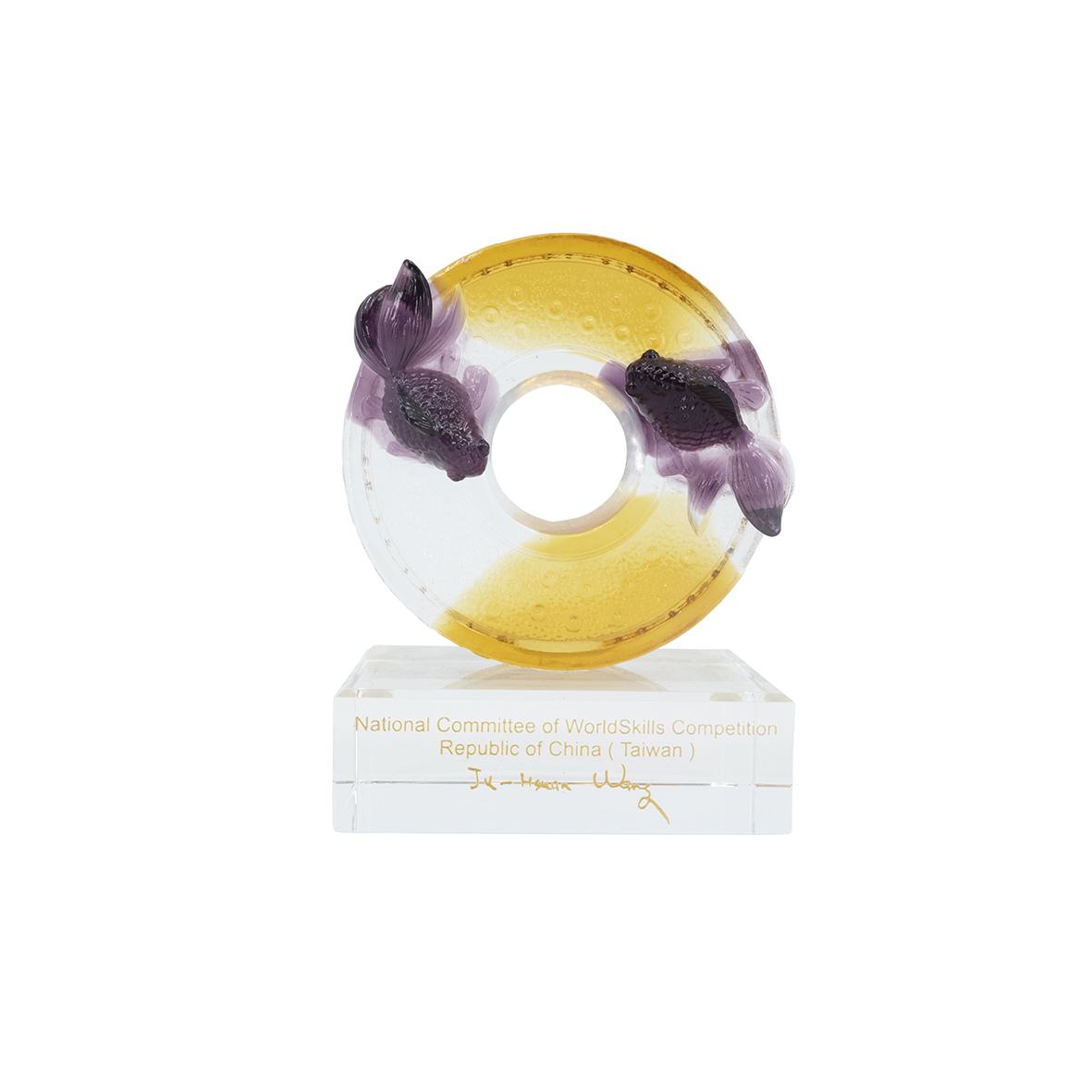 - Paperweight featuring two purple koi fish. The inscription on the base reads "National Committee of WorldSkills Competition, the Republic of China (Taiwan)."