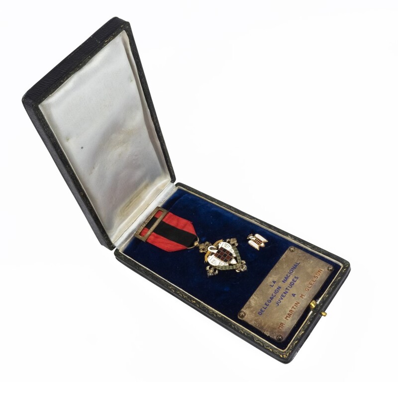 A dress medal and pin given to Martin Gleeson of Ireland by the Spanish organizers of the 1957 competition in Madrid. Gleeson was a delegate at the event and he would go on to become chair of the committee which brought the competition to Dublin, Ireland, in 1963.