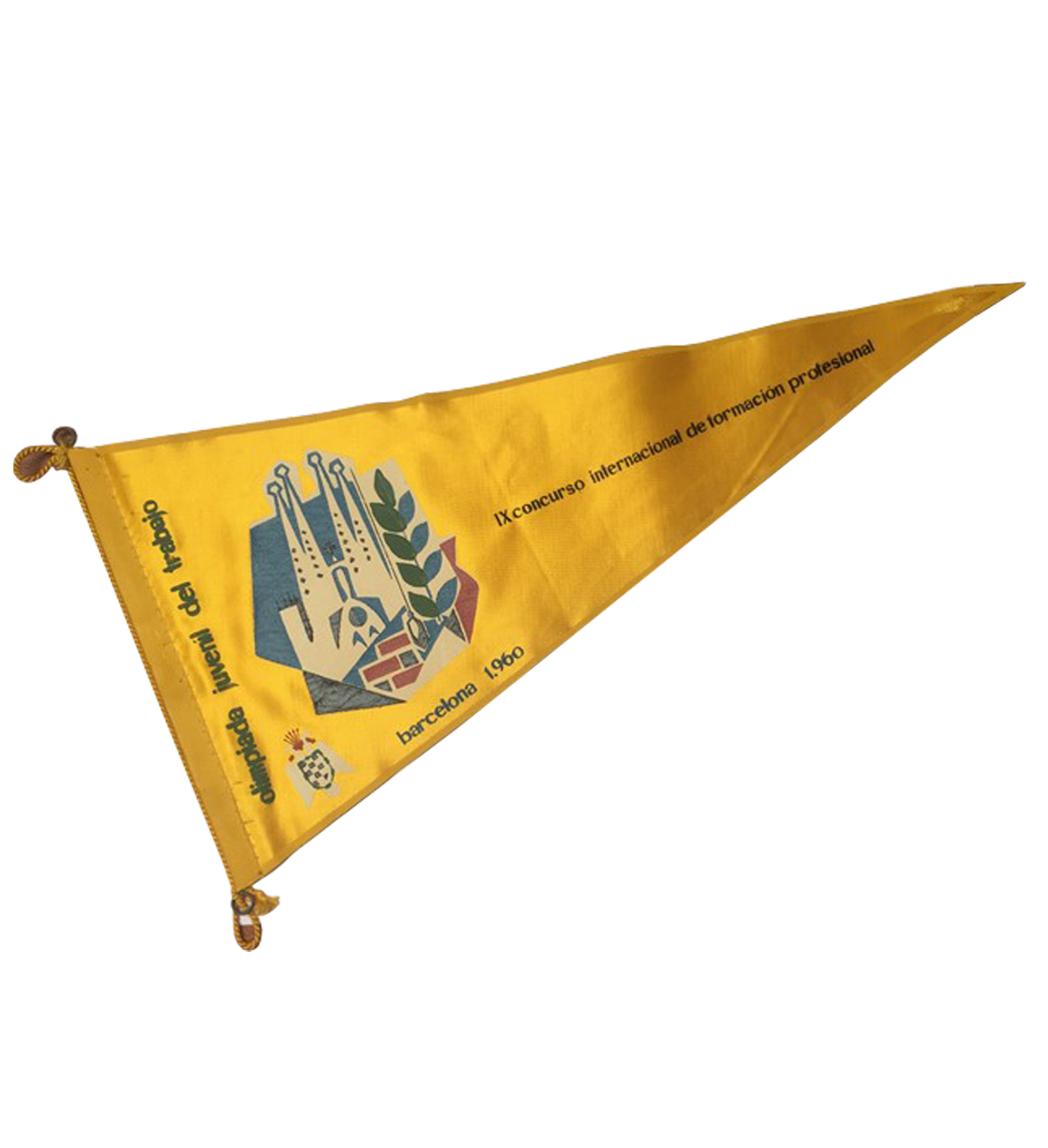 - A souvenir pennant for the 1960 competition in Barcelona. It is made from a silk-like gold material with a gold cord to hang. The design include the competition logo which feature the Sagadra Familia, a branch with leaves (olive?), and symbols representing skills, including bricks, a plumb line, and a pot.
