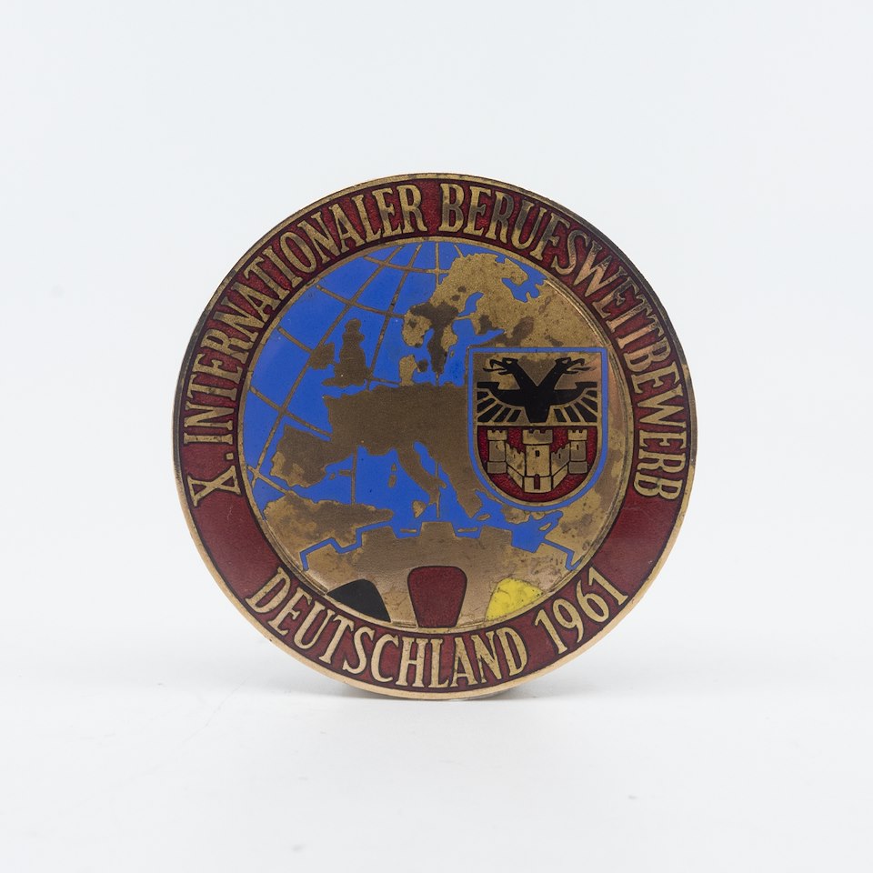 - A commemorative pin issued to competitors at the 1961 Competition in Duisburg, Germany. It shows the competition logo.