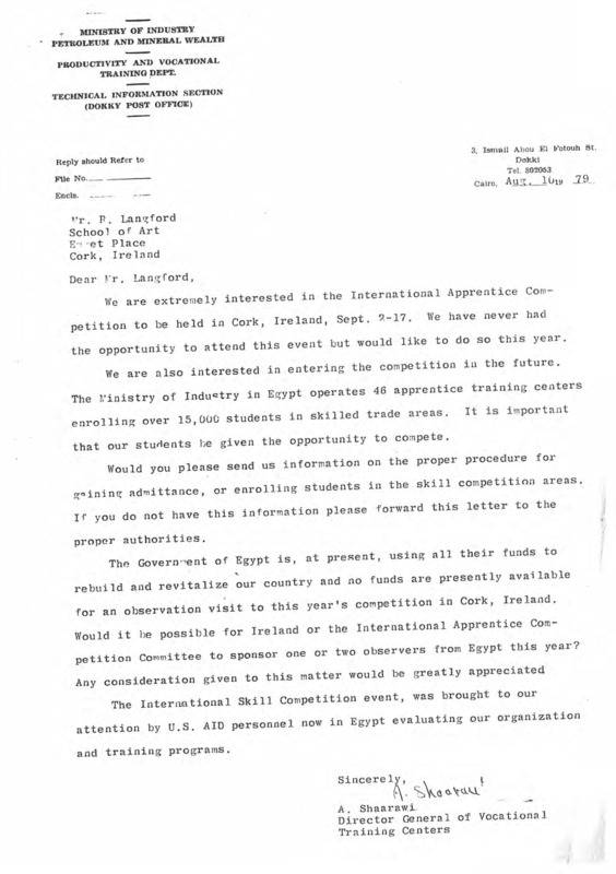 Subject: Sponsorship request for Egyptian Observers at the 15th International Apprentices Competition, Cork 1979 - Date
