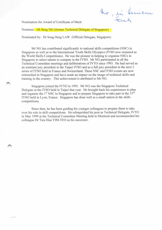 - Nomination for Award of Certificate of Merit to Ah Seng NG (former TD Singapore), by Dr Song-Seng Law (OD Singapore)