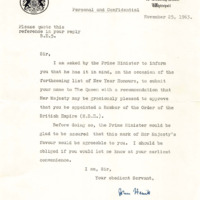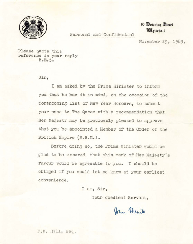 - Letter from the Prime Ministers Office to Fred Hill, 25/11/1963