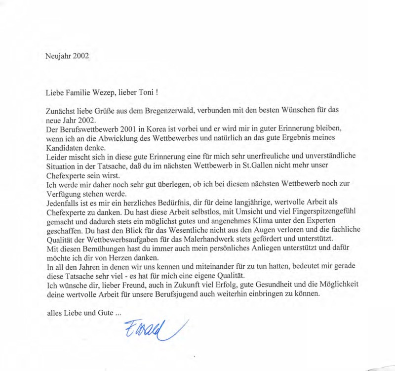 - The subject of this letter is a heartfelt thank-you and farewell message. The writer is expressing gratitude to Toni for his long-standing, valuable work as the chief expert in the context of a professional competition (likely related to the painting trade). The writer also conveys disappointment that Toni will no longer be serving as the chief expert at the upcoming competition in St. Gallen and reflects on the positive experiences and professional relationship they shared. The letter ends with well-wishes for Toni's future.
