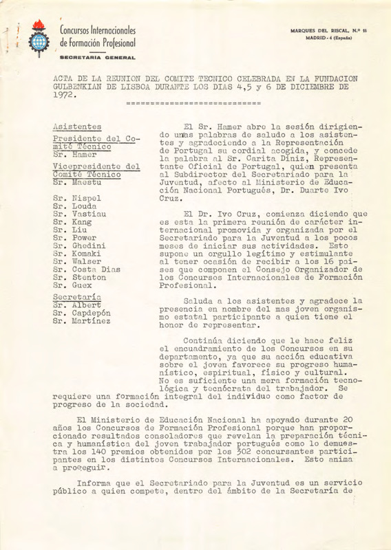 Technical Committee meeting minutes Gulbenkian Foundation, Lisbon, 4-6 December 1972