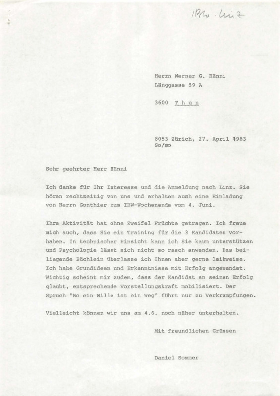 - Letter from Daniel Sommer to Werner G. Hänni, 27/04/1983