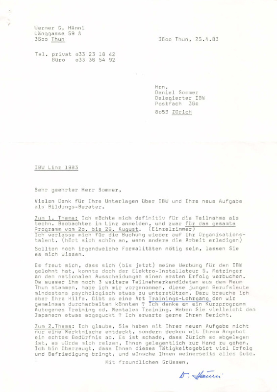 Letter from Werner G. Hänni to Daniel Sommer, 25/04/1983