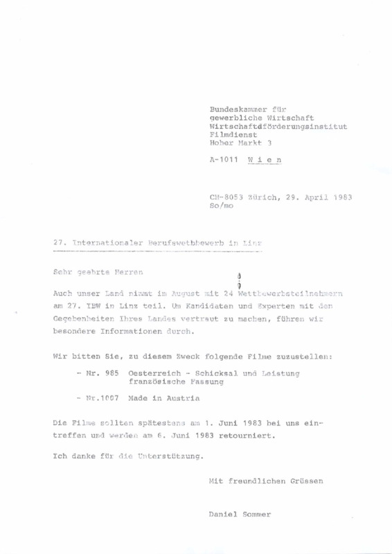 - Letter from Daniel Sommer to Bundeskammer für gewerbliche Wirtschaft Wirtschaftsförderungsinstitut – Filmdienst, 29/04/1983