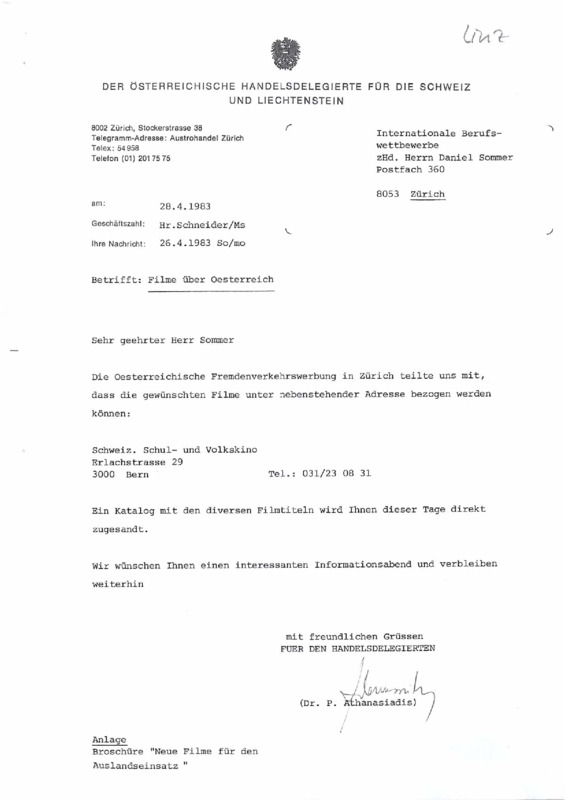 - Letter from The Austrian Trade Delegate for Switzerland and Liechtenstein to Daniel Sommer, 28/04/1983