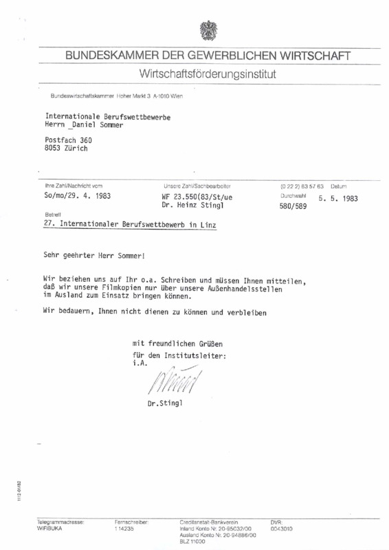 - Letter from Dr. Heinz Stingl, on behalf of the Wirtschaftsförderungsinstitut (WIFI) of the Federal Economic Chamber of Austria, to Daniel Sommer, 28/04/1983
