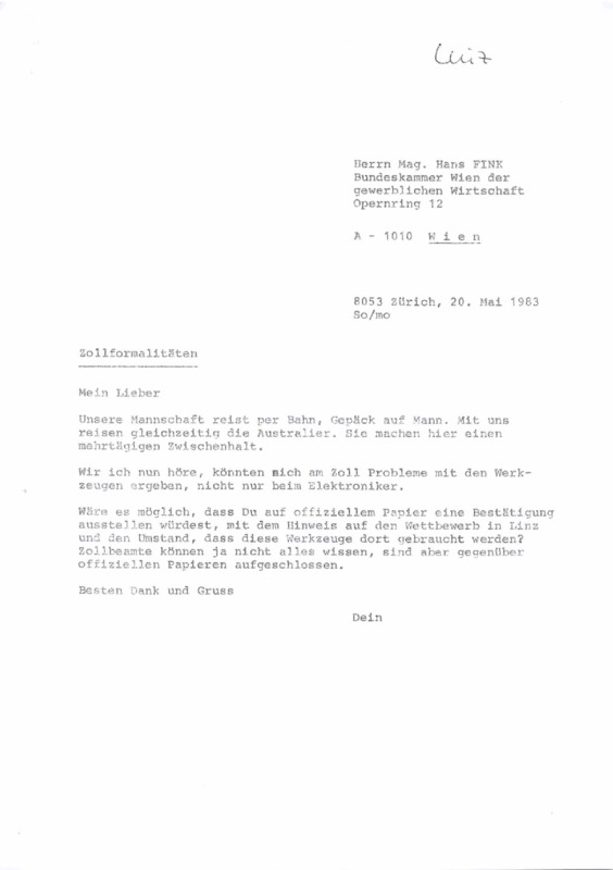 The letter informs Mr. Fink that the Swiss team, along with the Australians, will travel to Linz by train with tools carried personally. Sommer asks if Mr. Fink could issue an official letter confirming the tools are for use in the competition, to help avoid issues with customs officers who may not be familiar with the event. - Date
