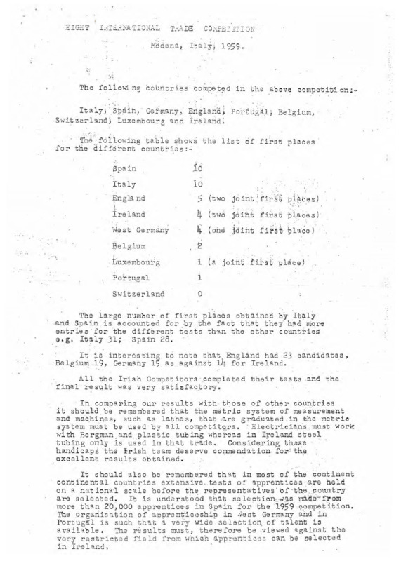 - Ireland’s participation in the 8th International Vocational Training Competition, Modena 1959