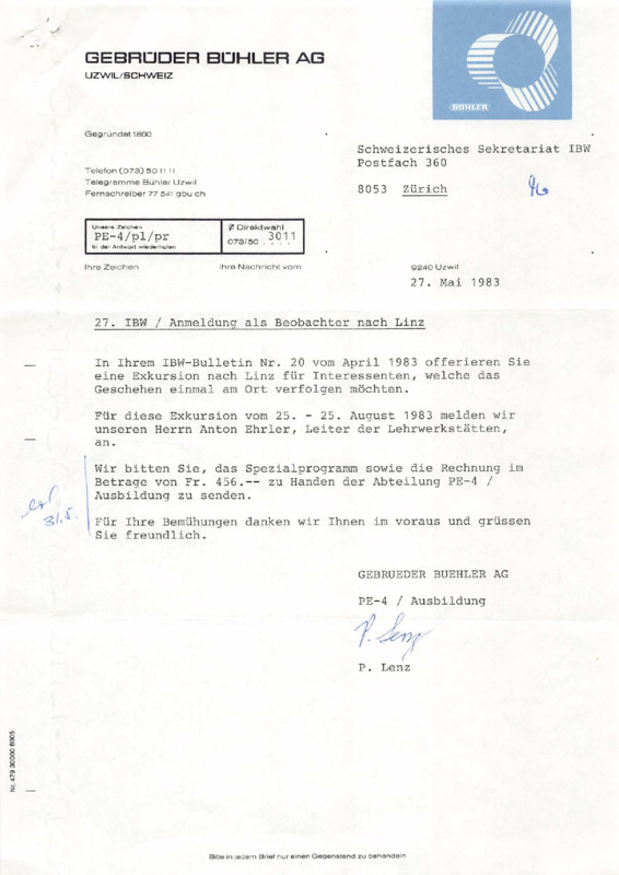 Letter from Gebrüder Bühler AG (signed by P. Lenz, Department PE-4 / Training)to Swiss Secretariat for the International Vocational Competition, 27/05/1983